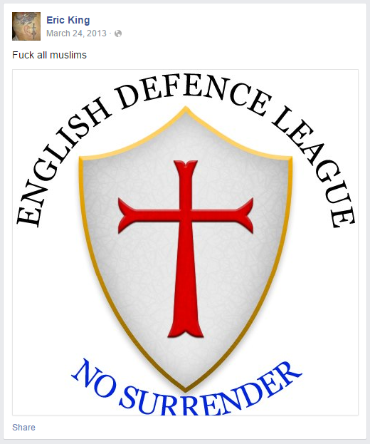 When he was seen by the police, King said: “There will be a war soon”. He said he did not like anything to do with Islam and saw Facebook as a mechanism for him to have a voice. “They can preach against us, why not us against them?” He had a previous conviction for assaulting a police officer and for harassment.