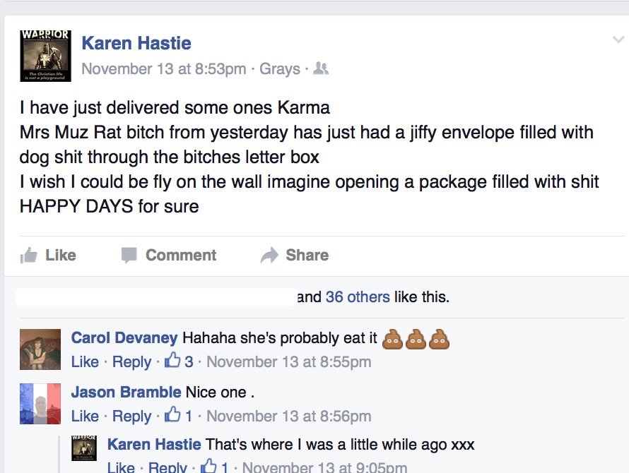 Essex woman cautioned after Facebook rant bragged of pushing dog poo through Muslim neighbour’s door