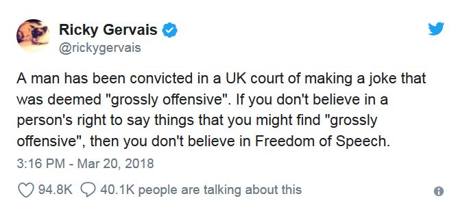 He said: “A man has been convicted in a UK court of making a joke that was deemed ‘grossly offensive’.