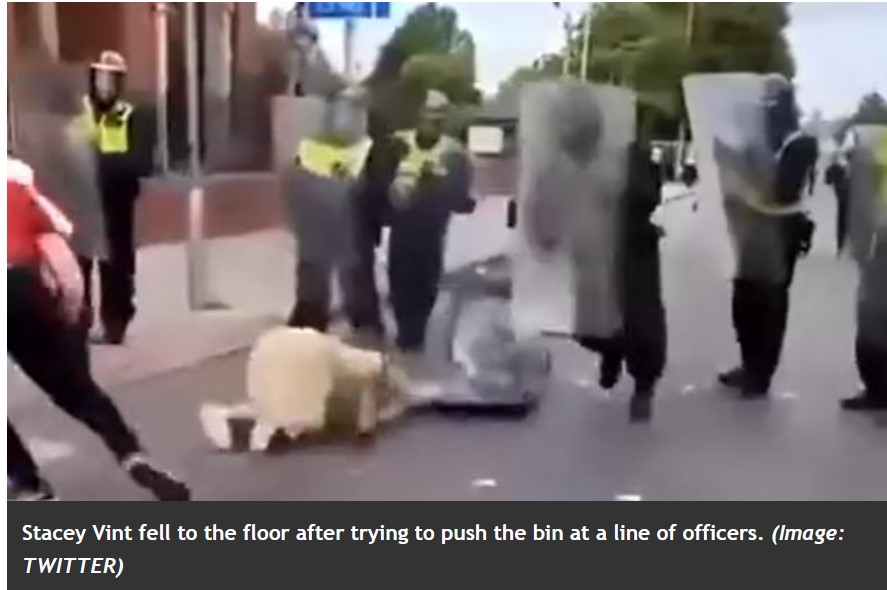 Stacey Vint, 34, was captured on video trying to shove the bin towards police with riot shields before falling flat on her face.