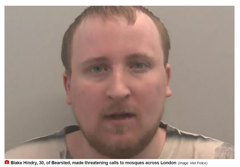 Following the call from a withheld number on August 5, officers from the Met Police established that four other mosques had been targeted in London by the same perpetrator. The calls were then traced to Blake Hindry, from Bearsted.