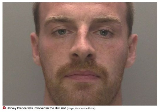 Harvey France took part in “serious acts of violence” and it was only by pure good fortune that no police officers were hurt by the “multiple missiles” that he threw during the rowdy disturbances and racist chanting, Hull Crown Court heard.