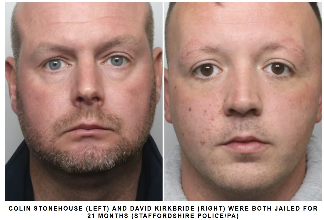Colin Stonehouse, 36, and David Kirkbride, 28, turned up at the Holiday Inn Express in Tamworth on August 4 wearing matching football shirts with their initials on, and joined a crowd of hundreds of protesters who caused nearly £100,000 worth of damage to the hotel.