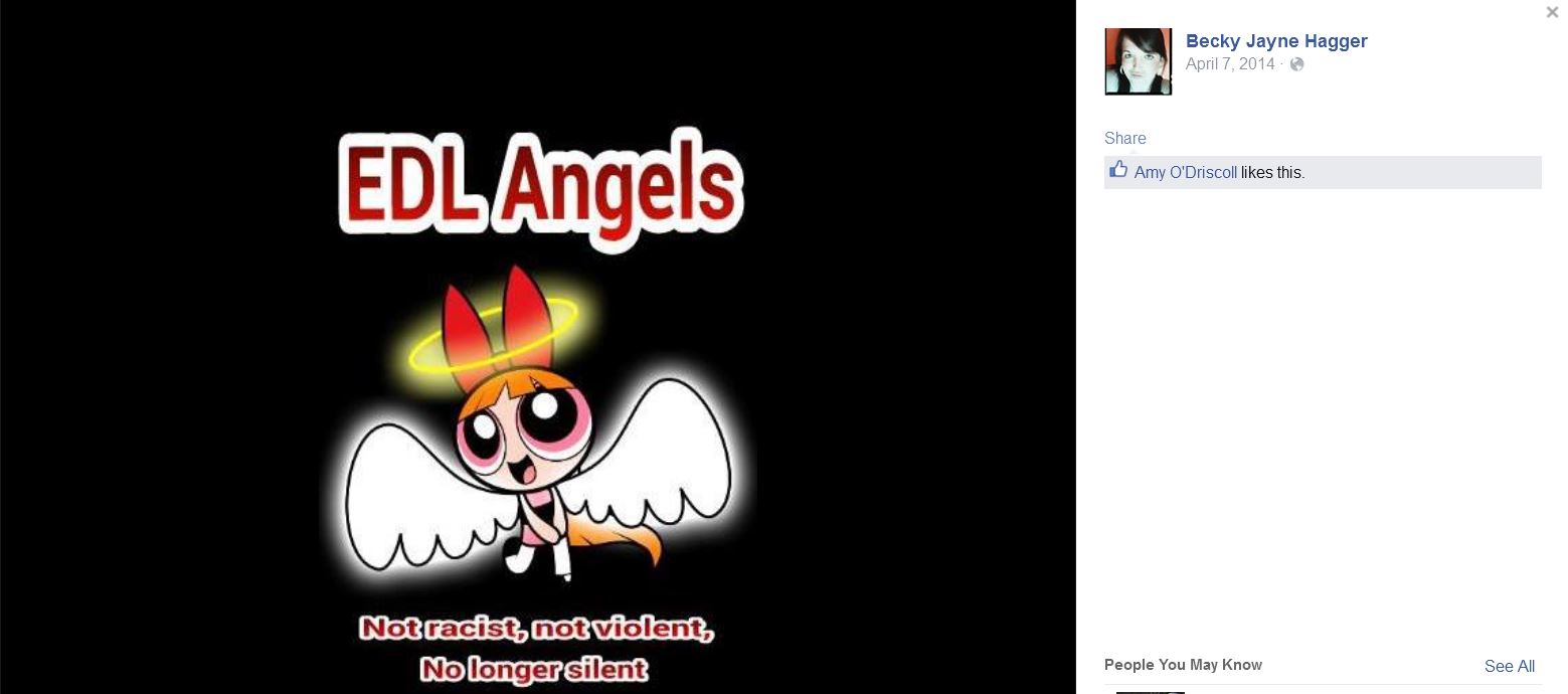 This story is from 2008 and pre-dates her involvement with the EDL but she is still subject to the banning order.