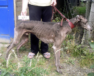 There, she found greyhounds Itchy, Ted, Tommy, George, Jack, Dixie and Jenny in the kennels, with just small scraps of paper for bedding.