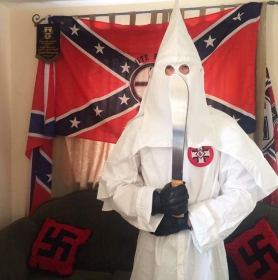 Other images found on a mobile phone show Thomas, dressed in the distinctive white costume of the KKK, looking down at his son through the eyeholes of a white, peaked hood.