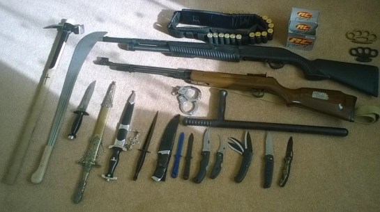 Jurors were also told he had pleaded guilty to unlawfully having a canister of CS spray among those weapons.