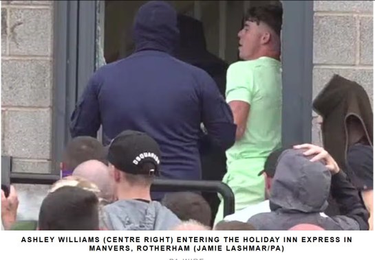Ashley Williams, 21, was caught on CCTV as he roamed around the Holiday Inn Express in Manvers, Rotherham, on August 4 with a fire extinguisher in his hand as more than 200 asylum seekers took shelter upstairs and staff barricaded themselves into the kitchen.