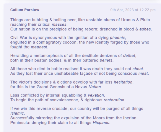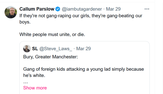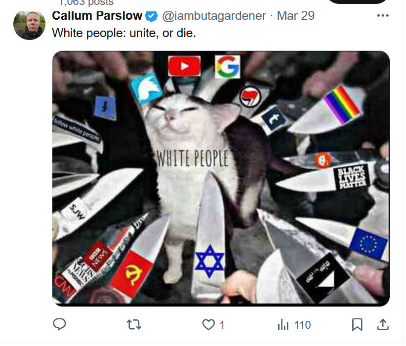 After the stabbing and as police closed in, Parslow tried to post a “terrorist manifesto” on X, tagging Tommy Robinson and politicians including Nigel Farage, Suella Braverman and Sir Keir Starmer.