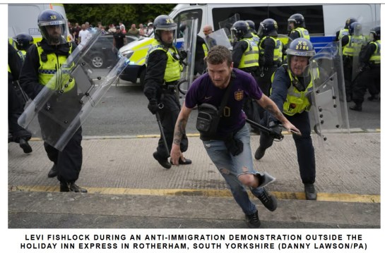Levi Fishlock was a prominent figure in the disorder outside the Holiday Inn Express at Manvers, Rotherham, with a judge saying he “played a part in almost every aspect of the racist mob violence on that terrible day in August”.
