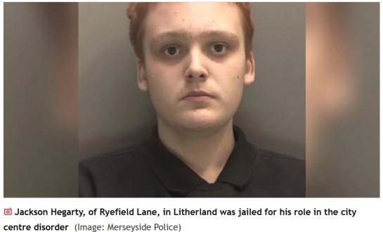 The court heard Hegarty handed himself in to police after his picture was circulated. In a police interview he admitted that he threw missiles and swore at police. He accepted “he ruined his whole life because of one day”. He was charged with violent disorder and burglary and admitted the two offences at Liverpool Magistrates’ Court earlier this month.