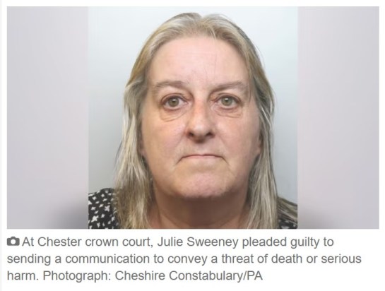 Julie Sweeney, of Church Lawton, Cheshire, pleaded guilty at Chester crown court to sending a communication to convey a threat of death or serious harm.