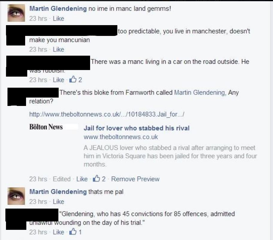 “His mother and his partner don’t share the defendant’s sentiments, and have a particular view about his behaviour that day,” Mr Kearney said. Goodwin, 24, of Kennington Avenue, Newton Heath, was jailed for 12 months. Goodwin and Grange both pleaded guilty to violent disorder.