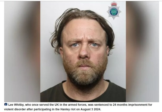 Lee Whitby, who once served the UK in the armed forces, was sentenced to 24 months imprisonment for violent disorder after participating in the Hanley riot on August 3 2024.