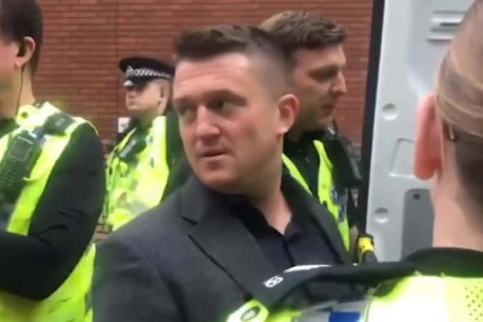 Tommy Robinson outside Leeds Crown Court. A screengrab from a video taken of Robinson as he was arrested by police.