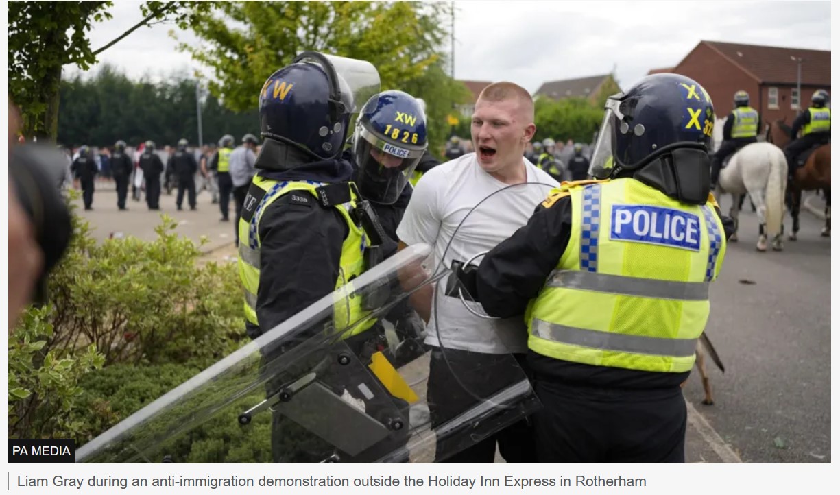 Niven Matthewman, 19, threw a chair at police and yelled “Yorkshire, Yorkshire” outside a hotel housing asylum seekers. He was sentenced to two years and eight months in jail for taking part in violent disorder on August 4 in Rotherham.
