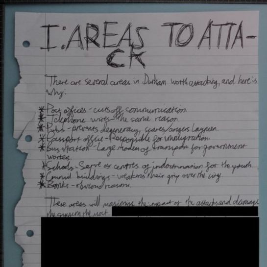 It called for lone-wolf terror attacks to fight against a supposed “genocide” of white people and listed proposed attack targets in Durham, including schools, public transport and council buildings.