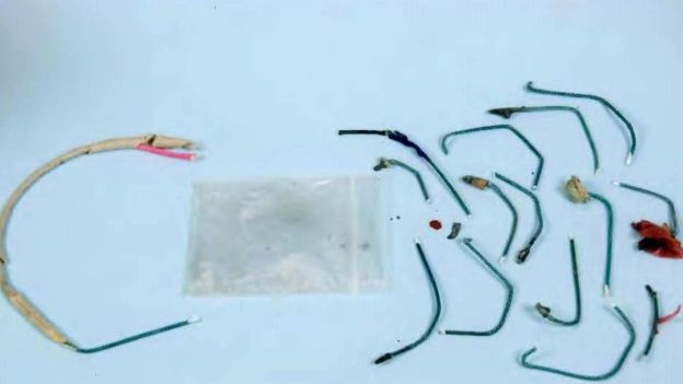 Police found a glass bottle studded with lead shot and nail gun rounds along with explosive powder, fuses, screws and steel tacks.