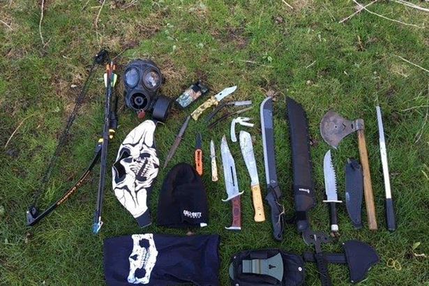 He said he had the axes and machetes for cutting wood and the cut throat razors for cutting rope and said a gas mask he was found with was due to a report of a gas leak.