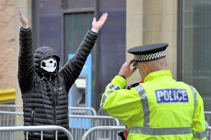 He was photographed attending the march with his hood up carrying a Scottish Saltire flag and holding a “white pride worldwide” poster.