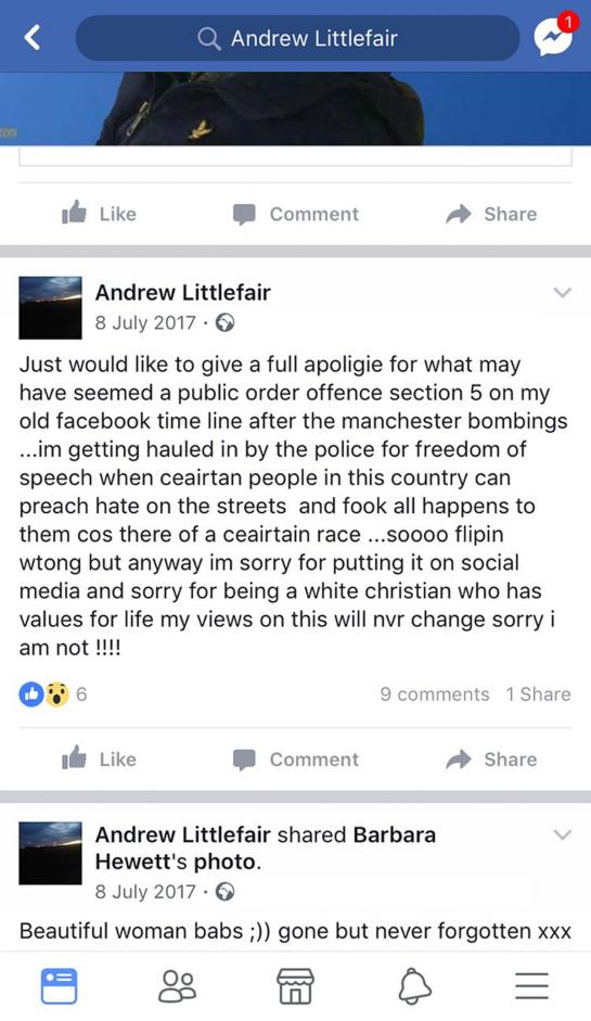 But he created five Facebook and three Twitter accounts under slightly different names so he could go on spouting filth.